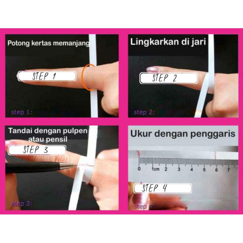 Jika anda tiada pita pengukur anda boleh gunakan kertas untuk mengukur saiz jari. Selalu kalau walk-in beli di kedai emas boleh pilih dan cuba di jari sebelum beli kan. Emas yang kami jual juga adalah.